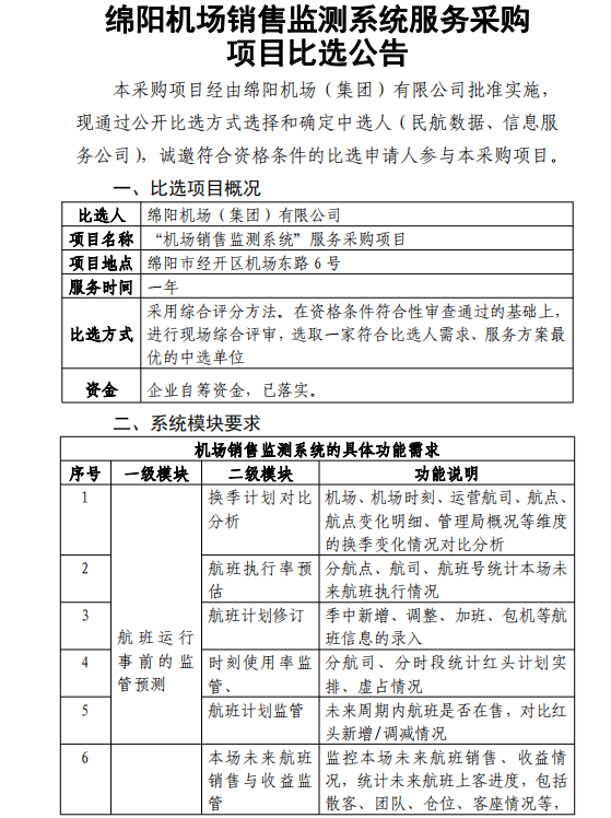 綿陽(yáng)機(jī)場(chǎng)銷售監(jiān)測(cè)系統(tǒng)服務(wù)采購(gòu)項(xiàng)目比選公告