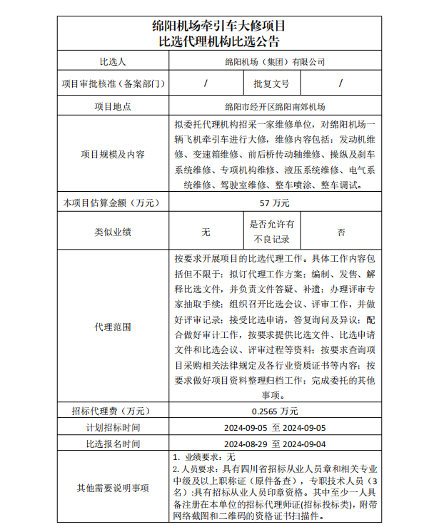 綿陽(yáng)機(jī)場(chǎng)牽引車(chē)大修項(xiàng)目比選代理機(jī)構(gòu)比選公告